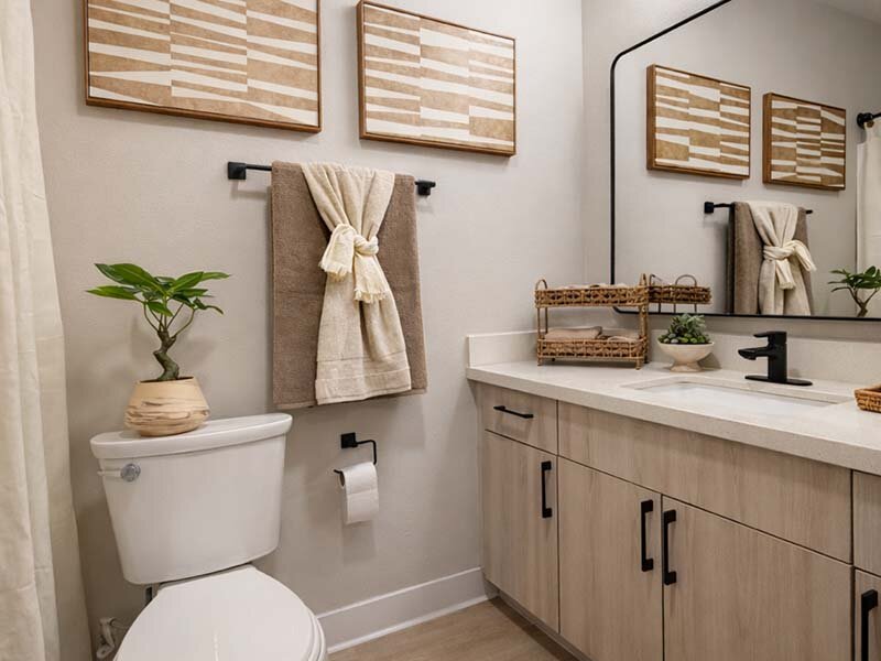 Bathroom with Wood Style Flooring and Cabinets | Highridge